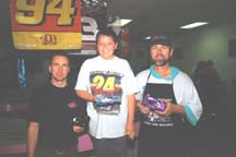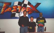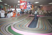 The race was a round robin with 10 total entries. Gary Hooks came out of the starting gate fast on orange with 41 laps and fast time of 4.327. It was a five way tie for second at 39 laps by Hopper, Marc Graessle, Wayne Grigsby, Ron Southern, and Vee. Mark Manion and Alan Ohashi filled out the field for the first heat with 38 and 36 laps each. Showboat came in on the second heat and turned 38 laps, but Gary did another 41 laps on white as did Hopper on yellow. In the third heat, Hopper did another 41 laps on orange while Gary sat out, and Tony Stewart came in on red for 39 laps. Mark Manion, Vee, Wayne, Showboat and Marc were averaging 38-39 laps per heat, Alan Ohashi around 36 laps. In the fourth heat, brothers Hopper and Tony turned 40 laps each as did Marc Graessle. Gary Hooks returned to the red lane in the fifth heat to the tune of 41 laps and the rest of the field had 36-39 laps, so Gary was literally flying around the track! Alan Ohashi had a good run on white with 39 laps, Wayne with 38 on yellow, and Marc and Ron with 37 apiece. Gary won the sixth and seventh heats with 40 on green and 41 on blue while Hopper returned on red in the 7th with 40 laps. At that point, Gary led Hopper 204 to 201. In the 8th and 9th heats, Hopper went into hyperspace and ran 42 laps each heat while Gary went to the inside lanes for 40 and 39 lap runs. Going into the final heat, it was Gary on yellow and Hopper on purple, Hopper with a two lap lead. Gary had a really hard time on yellow (many racers have had difficulty on that lane!) and Hopper was able to add two more laps to his lead to finish the race with 325 laps. Gary was second and Tony Stewart was some 13 laps in arrears with 307. Santa Rosa's Vee did really well with 306 laps, and Marc Graessle with 303. Alan Ohashi ran steadily throughout the race to finish sixth with 301 laps. Wayne Grigsby was seventh with 300 laps even. Ron Southern was 8th place with 299, Showboat 9th with 298 and Mark Manion struggled a bit to finish with 262 laps. You can figure that any 3 minute heat race on the Fastrax Kingleman with a lap total of 300 and higher, you are doing awfully well. All racers finished with respectable lap counts, and the race was very well run by all. After the NASCAR Expert race, we took a short 30 minute lunch break, and it appeared most racers visited the McDonalds.