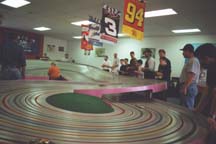 This was pretty much the same order all the way through the race. The second qualifier was won by Gary Hooks with an even 200 laps, the first time this mark was reached by a Plafit car on the 120' Kingleman. Ron Southern came in second equalling the previous track record of 196 laps. Former record holder Bob Krash was third with 186 laps, Santa Rosa's Mark Graessle in fourth with 181, Scooter in fifth with 177 and "O Boy" in sixth with 171. Racers not moving up to the main were Keith Eastmead, Scooter, Aaron Manion and "O Boy". The main event was won, not unexpectedly, by Gary Hooks with 294 laps in the three minute heat race. Gary did not lead all the way as Ron Southern and Marc Graessle were both hounding him from start to finish. Ron won the first three heats, but Gary turned 39 laps on the third heat to end up on the lead lap. In the fourth heat, Ron was on black and Gary moved into a one lap lead driving on the fast lane, orange. But, in the next heat Gary had a bad run of 35 laps on white and Ron made up a lap on yellow. Marc and JD Street were both within striking range of the top two drivers all the time. By heat #6, Marc and Ron were one lap behind Gary, but JD had dropped back after a low lap count on blue (34 laps). In the seventh heat, Ron moved back into a tie for the lead with Gary and Marc only one behind. Bob Krash moved past JD Street for 4th place as JD continued to have trouble on the gutter lane, black. The rest of the field, Mark Manion, Andy Waluto and Vee ran good races, especially Vee whose car was almost destroyed by the time the race was over. He did a good job just keeping that thing on the track!