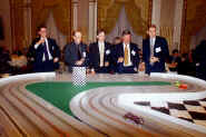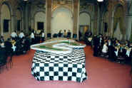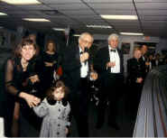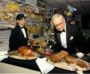 Leave it to master promoter Lou del Rosario to figure out a way to get slot cars with the suit-n-tie set on Wall Street! Elmsford's crew recently set up their portable four-lane layout in the boardroom at the stock exchange and after lunch members had an opportunity to find out that there's fun to be had in ways other than handling billions of dollars by trading stock. Our thanks to Lou for loaning us the pictures of his latest promotion. Just goes to show that any thing is possible if you work hard enough and long enough. There were no names with the pictures but they are pretty self-explanatory. There's also a few pictures of the exterior of the "new" (sounds funny, doesn't it, for a 36-year-old business!) Elmsford Raceway. The painted lines on the parking lot aren't for Lou to jet around in his Porsche sports car. They're there for the R/C racers. A BIRTHDAY PARTY TO REMEMBER! Elmsford Raceway played host & hostess to a catered, black-tie bash for the 75th birthday party of a good friend of the del Rosario's. The racing had to be fun but man, stoke out on the eats and liquid refreshments! You, too, can set up these little shindigs! Call Lou and ask him how much he charged for this one! |