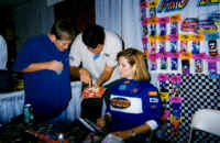 Darlene Haines of REH Distributing with MJW Raceway's Marvin & Janice Weidenhaupt | Dora Finley of STS looking at one of Andy Bunton's Beach Customs bodies |