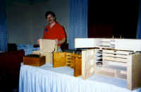 Jim Cichy showing examples of his new line of slot car boxes | Darlene Haines, Jerry Gonsalves & Bob Haines discuss the fun of slot car distributing |