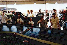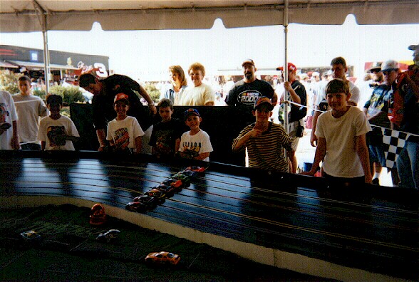 Sky divers execute complex aerial maneuvers called ‘relative work’ during 120 mph free fall, but must depend on an inflated canopy above them as they descend that last 1000 feet or so to earth. We’ve pretty much come to the conclusion that the owners of commercial slot car tracks depend on having brick, mortar, tile and roofing over their heads to protect their investment from the elements. Ah…but such is not always the case! Take the team of Erin and Matt Dresser…proud owners of Fireball Speedway, Inc. The Dresser’s, you may recall from the TOA convention in 1999, own a very successful body painting business in Florida. That year husband Matt located and purchased an old King track and was seriously contemplating opening one of those "brick ‘n mortar" store front locations. We are not privy to all the details as to why that did not happen, but can now happily report that business just couldn’t be any better. They’re having a lot of fun and making a lot of money…what every track owner strives to accomplish. Being successful doesn’t always mean a person can escape long hours, occasional difficulties, not to mention obstacles placed in the way as the road is traveled. And travel the road they have! We’re printing the story from Erin Dresser…who in my humble opinion has to be one of the loveliest slot car track owners in the world! We took the liberty of editing her copy just a tad because both Slotcar Bulletin and Scale Auto Racing News have also been sent this story. If you haven’t seen it, it’s well worth reading. This is how one couple went portable and profitable in the span of one year. TENT EVENTS Anyone getting into business these days needs to find a good "gimmick" to help "sell" products and services to as many consumers as possible. Picking the right "coattails" to ride can often mean the difference between success and Chapter 11. If you were going to ride a winner, the best set of coattails to hitch onto would be a proven winner – one who was already making zillions of dollars every year. How about riding one that’s also very fast? How about NASCAR? That’s what Matt and Erin Dresser have latched onto…and achieved a written contract in the process. Yes…they travel with their own very attractive tent, portable slot car track, large sound system and dozens of Parma cars and controllers. As Erin put on her letterhead, they feature what they call "Corporate Interactive Entertainment". Erin writes: "Fireball Speedway is the name we chose for our business. Once we signed the contract with NASCAR to set up our portable track for race fans we’ve been to Daytona (three times), Talladega (twice), Bristol (twice), California, Indy Raceway Park, and Gateway International – and it’s only October! Still to come during the remainder of this racing season is another trip to Talladega, Phoenix, Homestead and Rockingham. In 2001 we will be repeating the same schedule of races with the anticipated addition of races in Las Vegas, Dover and New Hampshire. Our first ‘Big Day’ arrived, and as we drove through the tunnel at Daytona International Speedway we both had to pinch ourselves to realize exactly where we were. This was the same NASCAR race track where legends had been created – drivers we’ve read about and seen on television hundreds of times. This was the place Richard Petty, Cale Yarborough, Bobby Allison, Fireball Roberts and Dale Jarrett have raced…and here we were…our first NASCAR Winston Cup Race…arriving with our beautiful, brand-new 66’ Tri-Oval Slot Car Track. The moment had arrived for our new mobile business. There is so much more to this ‘mobile action-packed entertainment package’ than just a slot car track! To go from race to race, the slot track rides in it’s own 14’ enclosed trailed, pulled by a 27’ motor coach. (We knew going in that staying in hotels and motels would be too costly, not to mention nearly impossible to book! Rooms at NASCAR hotel/motel sites are booked years in advance!) Our slot track is able to ‘beat the heat’ because it sits under a white 20’ x 30’ carnival tent. Part of the decoration are advertising banners and checkered flags – everywhere! We also use a state-of-the- art computer system which counts laps and allows us to set up races with duration of ten or up to 500 laps. Our sound system plays exciting car sounds and music. (The music is sometimes considered a bit ‘country’ because that’s often the musical preference of NASCAR fans. A visit to our exciting venue and you’ll hear "WipeOut" and selections by Charlie Daniels and the Allman Brothers.) The pit crew is dressed in matching uniforms and wear microphone headsets to announce the races and for giving instructions. For night racing we’ve installed 1000 watts of electric lighting so we can keep going after the day’s racing on the big track has finished. The B-I-G QUESTION??? Having invested our entire life’s savings into this new mobile business…WOULD THEY PLAY??? Daytona was the perfect test and proving grounds. I had spent three solid months, making hundreds of phone calls and mailings, just to secure the opportunity to participate as a small business owner at the Daytona 500. Once we were able to secure the Daytona 500 it also meant that – if we did well – we would have the opportunity to work with the International Speedway Corporation Group and go to more of their race events around the country. What we happily discovered…NASCAR fans LOVE the mini racing leading up to the ‘real thing.’ We became the ‘appetizer’ to the main course – Winston Cup Racing, naturally! What makes it all so much fun has been the development of quite a following from race to race. Now when we return to a venue, many of the same enthusiasts are there – waiting for us to finish the set up and open so they can play! Regularly we hear a guy say to his son or buddy…"I used to race these. They’re slot cars! You