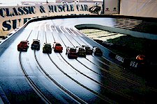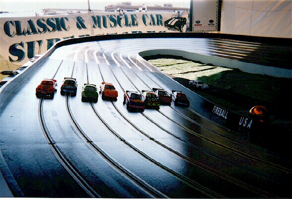 This is "Happy Racing!" We are working hard. The hours are long and hard. The travel can get tiresome. However there are benefits: Matt and I get to spend a lot of time together. We are meeting a lot of new friends, and we are making money! Overall this is a lot of fun! Hopefully we are spreading the word about slot car racing and what a blast it is – not to mention that – "Hey folks!…slot racing is still around!" ED. NOTE: Erin wanted us to be sure to let readers know just how important their sponsors have been to the success of their new business. She says, "We have received extremely valuable sponsorship and support from Mike MacDowell of Parma International, Inc. as well as Ron Hershman of Fast Ones. I can highly recommend the Parma FCR® cars to all track owners. They have been fantastic and held up very well to the ‘challenges’ given them by the various drivers – most of whom have absolutely zero experience until they have driven the FCR® car for the first time here." Erin adds, "The fans really love the competition involved in qualifying because we stage three championship races each day. A championship board displays the winning racers’ names and fastest lap times. Racers and fans alike stop by regularly to see if their time or their buddy’s time is still ‘on the qualifying board!’ And in addition to Parma and Fast Ones, some of our really great championship prizes have been provided by sponsors such as Oakley Sunglasses, Vans Tennis Shoes and USA/Florida. Thanks to all our sponsors!" In the padded envelope with her story and a few photographs which we’ve used on the cover and inside, Erin also sent us a neat video copy of their advertising. What a great way to promote their business and slot car racing! I loved it! Also recommend that the Dresser’s find a hole in their schedule next summer so they can attend the TOA convention for 2001 and bring their video with them so you can see. What I liked was the shots taken from the tiny on-board camera on the Orange Lane. This has been done before, but it’s always neat to see what it would look like from the cockpit of a slot car traveling at a scale speed of 1200 miles per hour! (I’ll never forget Tim Ferguson’s adventure at Georgia Hobby back in 1990. He duct-taped a mouse inside a winged 27 and took several laps full punched on a Purple Mile! Would you believe? The mouse survived. Ah the tale it had to tell to its offspring…if it had any after that wild ride! KEY WORD - "ENTERTAINMENT!" Watching the video advertisement for Fireball Speedway was a wake-up call! Hey…this is what slot racing should have always centered around…fun for the masses…period! They are doing what we did when we first started playing with these cars forty years ago…just a bunch of kids having a good time, chasing each other with little toy cars. Think about what good sense this concept offers: