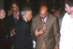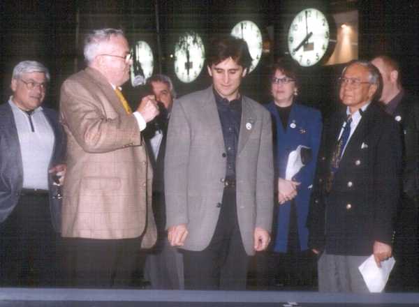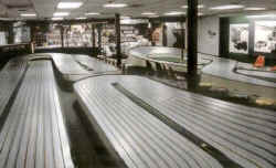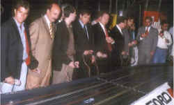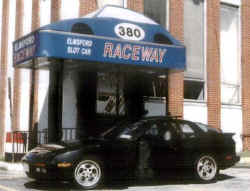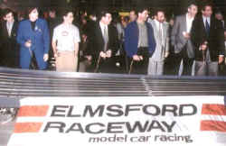 camp for kids with cancer and other life threatening blood diseases. Six of Auto Racing's shining stars convened in the Atrium at the Toumeau Time Machine to race for the kids. Paul Newman's partner Carl Haas, Chip Ganassi, Bobby Rahal, Brian Herta, Christian Fittipaldi, and, of course Alex Zanardi came to race, and race they did! The competition while always friendly was nonetheless intense. People paid $25.00 to come in, feast on unlimited drinks and hors d'oeuvres and watch top race car drivers race slot cars on the Steve Ogilvie Tri-oval. A huge screen was erected so that those without a good direct view wouldn't miss any of the action. Excellent camera work assured that nothing was missed. Everyone who came also received a handsome goody bag chock full of all kinds of good stuff. $50.00 more could get you a chance to actually race against the stars during the practice sessions. An auction was held which made over $25,000 for the charity with people bidding on such items as autographed checkered flags, a mint condition, still in the box Chaparral slot car, and the actual slot cars autographed by the drivers and painted in 1/1 scale terms, donated by Elmsford Raceway. Plans are already underway for a repeat performance next year. |