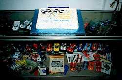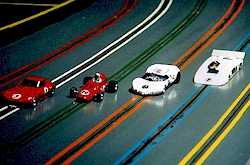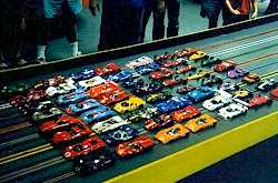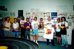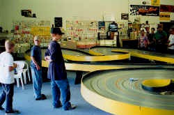 color! Of the four places visited on this all-too-short trip, the Sarkelas place was the closest to where we were staying, so went there the first night. Mark very graciously loaned me two cars and Frank loaned me his trusty Ruddock controller. Didnt help came in dead last in the first race and fourth in the second. Oh well good time was had by all and Ill get em next time or, whenever I figure out how to let off the trigger in that kink on the back straight! The second race was a bit more to my liking slower cars! They were Parma International 32s with Pla-Fit motors the same exact cars we used to run back in 91 at the old track in Decatur, Georgia. Slot Car Raceway is very spacious and crammed full of tracks, drag strips, plenty of pit space, showcases and tons of inventory not to mention a dedicated group of enthusiastic competitors who talk while they race and laugh a lot. After the melee on the track concluded we did what I do best bench race and talked about the "good old days." Theyve put together an entire showcase of museum pieces (see picture with the cake on the top) and a lot of very old items from w-a-y back. I really enjoyed chatting with the guys and trying to race. Ha! That was a joke! Local track knowledge was very evident as most of the racers were passing me about every third lap. I got even I nerfed most of them at least once or twice. I wish I had more on the history of the raceway because theyve been around for awhile and joined TOA in 1997. If you ever get a chance, drop by and pay them a visit. Take your best cars and have a blast! Oh yes how to get there spend a couple of hours in extremely heavy traffic wend your way to Santa Rosa and turn onto Piner Road. Theyre right on one of the main drags. Thanks Frank, Mark and the racers. |