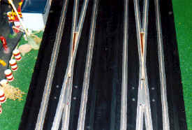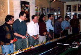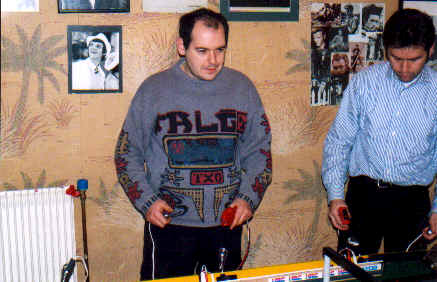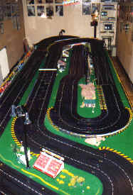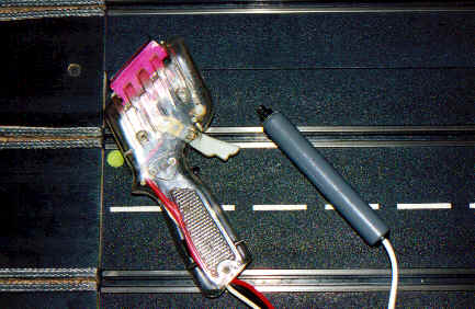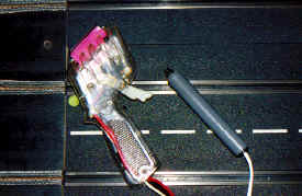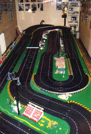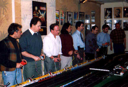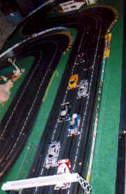 now... Two French slot racers, David and Victor, have invented a 100% electronic system called DAVIC, commercialized by French track-builder and distributor Mini-Racing (www.miniracing.fr). The Davic system is still in the prototype stage, but has been in use for several months at the Scalextric Club Ile-de-France, near Paris, and was installed at the Squash Montmartre commercial raceway (and squash club) in Paris in November 1998. How does it work? As photo shows, most of the intelligence is added under the track. Each car is fitted with its own little chip, connected between guide and motor, that allows the system to track the car no matter where it goes. The Davic system itself comprises a computer and lap counting/timing program, two (or more) lane-change sections, an overhead bridge with light sensors before each section to relay the commands and all the electronics lurking under the track. The system works with standard Parma-type controllers; in fact, you can use any controller, no matter what the ohm rating, since there's a knob on the control panel to adjust sensitivity. For the moment, the lane-change switch is a separate push-button, wired to the control console. If needed, the button could also be mounted on the controller handle, or anywhere else. Lane changers On the four-lane plastic track in the photos, at the Squash Montmartre raceway in Paris, there are two sets of lane changers: one that lets cars change between the two inner lanes (lanes 2 and 3) and one that lets cars change between the inner and outer lanes (1 and 2, 3 and 4). A two-lane track would only need one lane changer, although you could install two on a longer track. And what about 6 or 8-lane tracks, you ask? Well, bunky, you don't need 6 or 8 lane tracks anymore! The Davic system can now handle up to 8 cars, and Dave and Vic are working on increasing capacity to 12 cars. But before you get ambitious, first try keeping track of 8 cars on a single lane... The lane changers are routed in wood, custom-built to fit the track in question, whether standard plastic (Scalextric, Ninco, Carrera) or wood. An electronic solenoid-controlled switch shuttles cars between lanes. The clever thing here is that your lane change button will change only your own car! Of course, if another car is right behind you, or in front of you, it will get changed too. Which means you have to think twice before blindly switching lanes. Putting your chips down There are as many car-mounted chips (microprocessors) as there are driver positions. At the Squash Montmartre track, for instance, there are eight different basic chips, numbered 1 to 8. Each driver buys, rents, borrows or steals a chip. A plug is soldered onto the motor terminals, and the chip is plugged in; leads from the chip plug into the guide. Drivers then stay at the station corresponding to their chip number throughout the evening's racing activities unless a segment has several cars with the same chip number, in which case one of the drivers has to change. Not much fun, but the chips plug in pretty easily. The Race Director also becomes the chip director, which may involve a little horse trading.... Race Report The other evening I entered my first race on a Davic-equipped track. Two impressions strike you right away. First, the race is incredibly realistic. You plug in your controller and you race for 20 minutes, or whatever the length of the race, without a break and without lane changes! Second, you cant relax any more: no more getting into autopilot mode, with your only worry an occasional nerf. You are constantly running into a slower car on your favorite lane, or a faster car is riding your bumper and trying to pass. Which means that not only do you have to concentrate on your driving, you have to think about the best time and place to pass. A typical lap on the track shown here, with the faster Ninco cars, takes about 7.5 seconds. And during that time you have to make decisions on two lane-change points. Coming up on a slower car, do you wait for him to fall off? Or lose a few seconds by switching lanes, outrun your adversary and build up a short lead, then switch back into your favorite lane . while looking out for the six other cars on the track! Basically, everybody will decide that lane 2, or lane 3, or whatever, is the best, and they'll try to stay in it. What happens when 8 cars go for a single lane? You got it action! In theory, cars that come off can be replaced on any lane. But in practice, you designate an outer lane (near the drivers) as a "pitstop" lane, and all deslotted cars are always replaced on this lane, to avoid getting in the way of the constant stream of fast-moving cars. If you deslot another car by bumping into it from the back, or by colliding during a lane change, the race director yells "stop and go", and takes you off the track for a 10 second penalty. In reality, this doesn't happen very often: things move too fast, and people generally pay attention. But there is a fair amount of deslotting, because the cars are often in contact; it may also be because it's a new system. The computer system gives you a second-by-second readout of the race, with each drivers position, number of laps behind the leader, total lap count, most recent lap time and fast lap! At the end of the heat you can immediately print out the results. So far, reliability of both electronic and mechanical parts has been excellent. By the time I'd finished the evening, I was a convert! This is a great way to go racing! Big Bucks The biggest drawback is the price. Although still in prototype stage, the complete system costs about $4,000 that's including a computer, software, all electronics, two complete lane-changers and a set of chips. Volume production may lower that a bit, but probably not very much. Extra chips will retail at about $15. For the moment, the Davic system has only been installed on 1/32 or 1/24 plastic tracks for home or club. But there is no reason it won't 