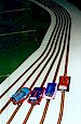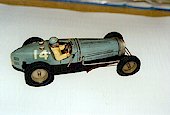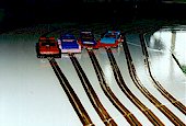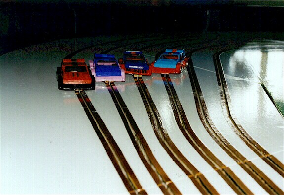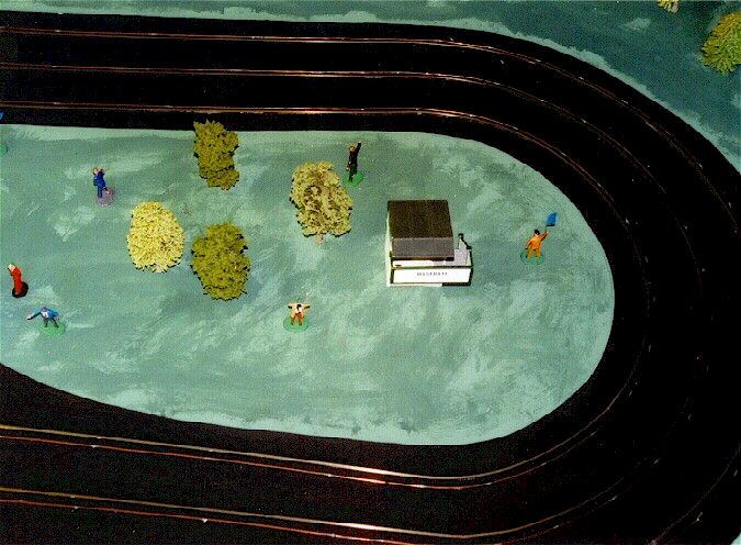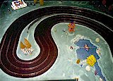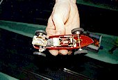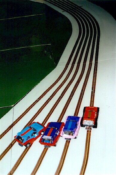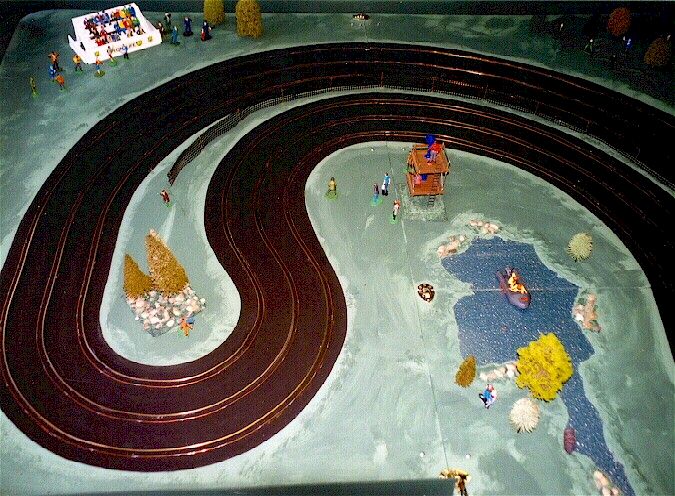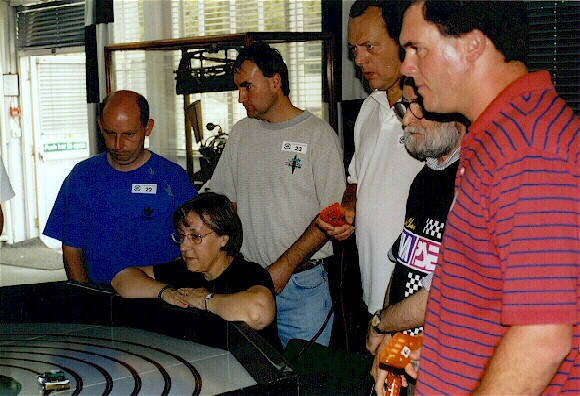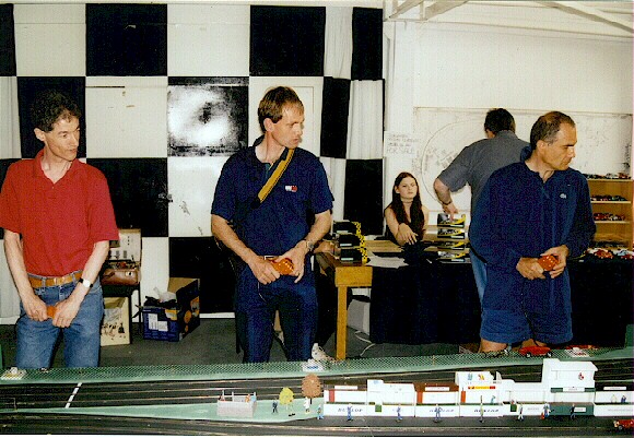 DÉJÀ VU – WAY BACK TO THE BEGINNING 2000 RAIL RACING FROM ENGLAND From Don Siegel, our French Correspondent Here’s a small feature for the newsletter. I don’t know if the members have been following the story, but in recent Scale Auto Racing News and Slotcar Bulletin, a Welshman by the name Jeff Davies announced a memorial event at the old Brooklands Race Track in England. It was to honor the invention of rail racing – the predecessor to slot racing. Jeff, along with his son Richard and a buddy, Phil Barry, built a new 45-foot three-lane rail track - the first in almost 40 years! Brooklands, now an auto/ aviation museum, donated their Chequered Flag room. We spend August 20th playing rail racer! Several of us, including me, built new cars for the event. Others took very old cars out of the bottom of their pit boxes. Charlie Fitzpatrick, the man behind Betta bodies made an appearance with his wife. He actually remembers racing rail racers back in the 50s! There was a scattering of other rail racers, and a number of enthusiasts from all over Britain, including some hot shots from the North London slot racing club. They also happen to be collectors and big enthusiasts of vintage racing. It was a whole day of activities, with the rail track open for practice (and we needed lots of it just to get the cars running!) and some amicable 5 lap races with ‘human counters.’ (Couldn’t go much higher.) FOUR-LANE "SLOT STOX" There was also a 4-lane Ninco setup with the new go-carts. The portable track was called "slot Stox and would probably be most interesting for TOA members. As you can see in the photos, this layout is a small Tri-Oval, with a long chicane section. The cars were making laps in less than 3 seconds, even at reduced power, and this mades for some very exciting action! The cars used were strengthened Parma Womp Womps®. I think these have become standard for these demonstration type events. The organizers probably have more sophisticated dirt-track type racers for the more serious, experienced racers. This is what the Brits call "stock racing" by the way - but with NASCAR becoming more and more popular over here I think they’re getting used to the new name. These races were incredibly fun and certainly a crowd pleaser! They had a very professional set up too: arriving in the morning and getting the oval up and running very well in short order. The races ran very efficiently, using some cabalistic system with a grid and getting 33 racers through without any problems and into the two semi-finals. This system would well be worth looking at for U.S. commercial raceways. The track doesn’t take up much room and has guaranteed action. I think they turned down the voltage for novices like us. I can try to find the number of the organizer, Ian Rivett, if anybody is interested. These cars were pretty standard, but the cars that came out for the rail event - well, just beautiful craftsmanship, all around. I think you can see that in the photos - especially that Bugatti 35, Number 14. The body was carved from Balsa and the lower black panels are actually the chassis side members! Just about all the cars were built to this quality, whether new or the old ones. Things are up and down here. Our club seems to be doing well, but I get there very infrequently. Seem to spend a lot more time writing, collecting, working(!), and trying to improve my ping-pong! That’s all for now. Take care.
